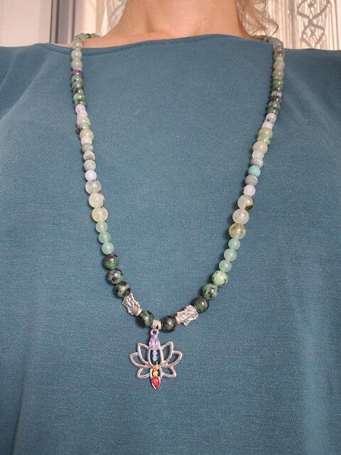 Die Lotus-Mala besteht aus Chakrasteinen und den Heilsteinen Zoisit, Grüner Aventurin, Matter Achat und Turmalinquarz.