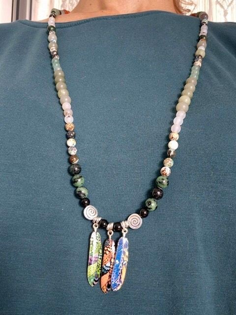 Diese Mala mit dreifarbige Federn und Silberspiralen wurden mit den Heilsteinen